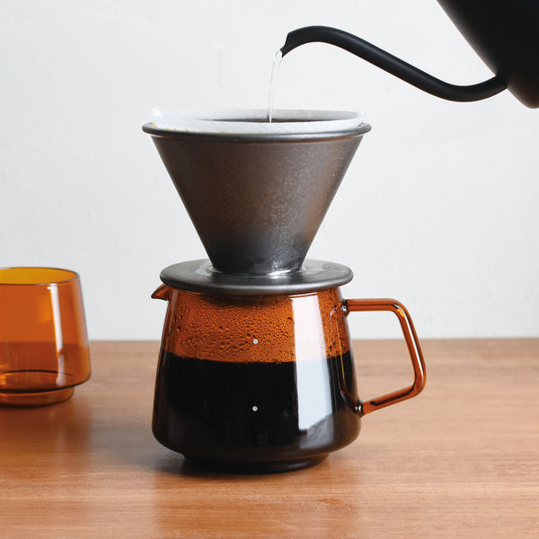Kinto Sepia kanna úr hitaþolnu gleri (750ml). Merkingin á veggnum gefur til kynna 2 og 4 bolla (300 og 600ml).